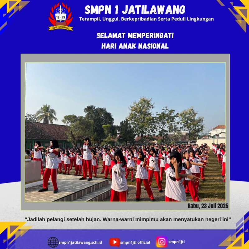 Jatilawang ( 23/7) _ SMPN 1 Jatilawang memperingati Hari Anak Nasional yang diperingati pada hari Rabu, 23 Juli 2025. Acara dimulai dengan menyanyikan lagu Indonesia Raya yang kemudian dilanjutkan dengan sambutan dari Kepala Sekolah SMPN 1 Jatilawang, Ibu Sri Mardiyani W., S.Pd. dan ibu pengawas SMPN 1 Jatilawang ibu Dra. Wiwi Parluki M.Pd., yang menyampaikan pentingnya kegiatan ini dalam rangka menanamkan nilai-nilai positif kepada anak-anak, terutama dalam hal pendidikan dan semangat Anak Indonesia.