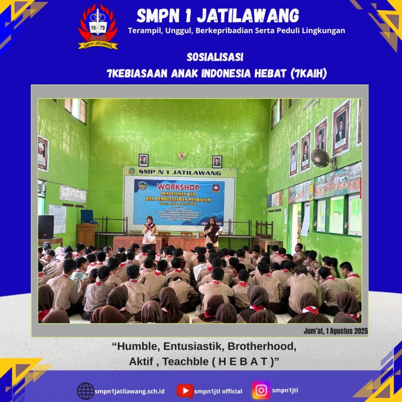 Jum'at, 01 Agustus 2025 SMPN 1 Jatilawang mengadakan sosialisasi 7 Kebiasaan Anak Indonesia Hebat (7KAIH) yang diikuti oleh siswa kelas 7, 8, dan 9 dan Guru Bimbingan Konseling di SMPN 1 Jatilawang yang memberikan sosialisasi tersebut. Kementerian Pendidikan Dasar dan Menengah (Kemendikdasmen) telah meluncurkan sebuah Program Gerakan 7 Kebiasaan Anak Indonesia Hebat (7KAIH) ini hadir sebagai sebuah upaya konkrit dalam membangun karakter dan kompetensi generasi muda bangsa.