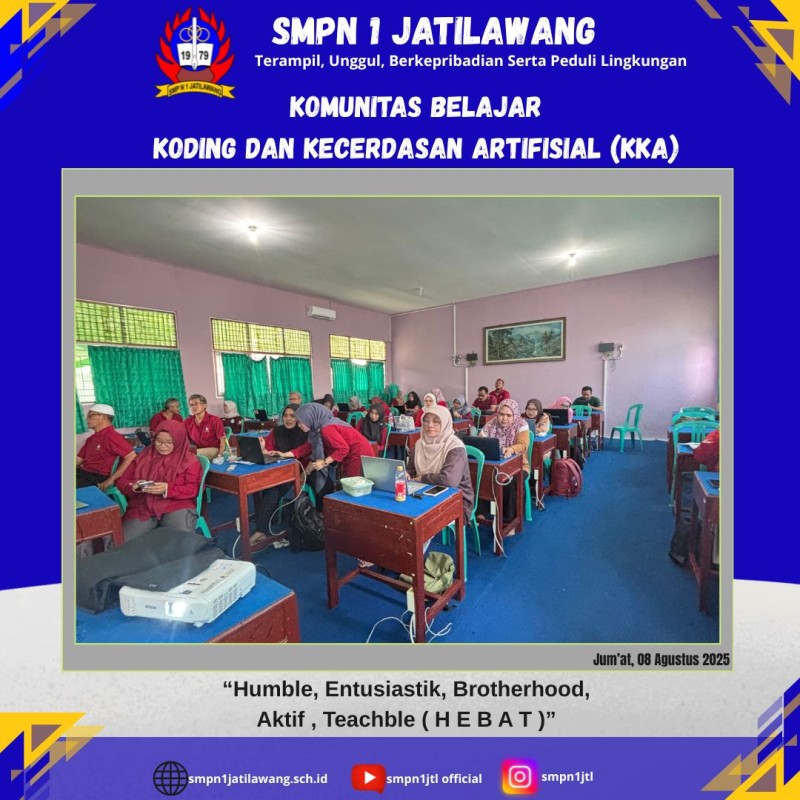Bertempat di Lab Bahasa SMPN 1 Jatilawang, kegiatan ini mengangkat tema “Koding dan Kecerdasan Artifisial (KKA) Inovasi, Dampak, dan Masa Depan Tekhnologi Cerdas". Komunitas belajar tersebut diikuti oleh seluruh guru SMPN 1 Jatilawang dengan narasumber ibu Embun Permatasari, S.Pd.