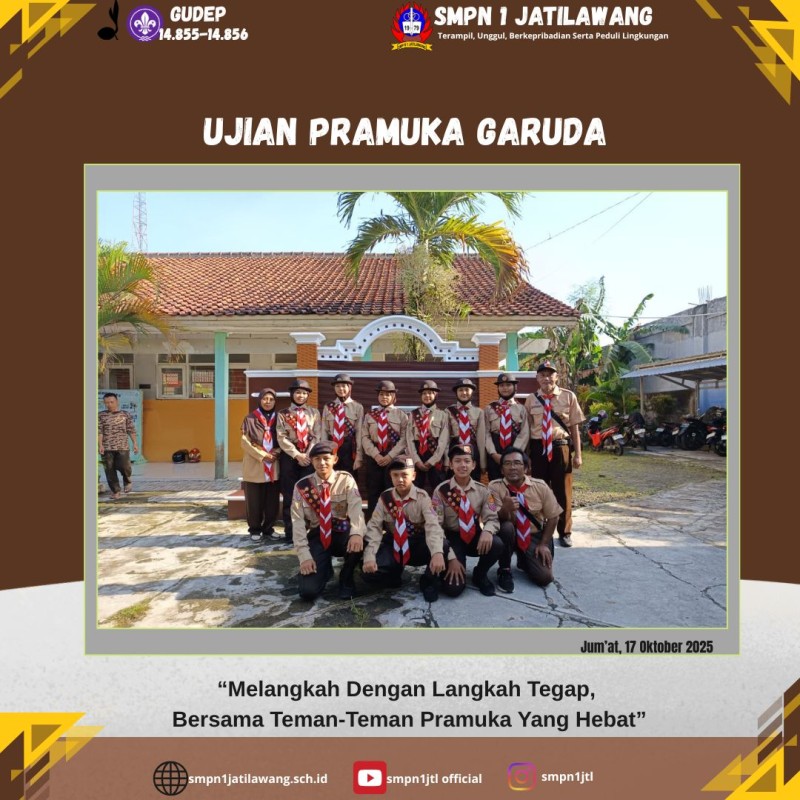 Jatilawang, 17 Oktober 2025 – Sebanyak 31 peserta calon Pramuka Garuda dari SMP Negeri 1 Jatilawang mengikuti ujian Pramuka Garuda yang diselenggarakan oleh Kwartir Cabang (Kwarcab) Banyumas. Kegiatan ini berlangsung di SD N 03 Jatilawang dan didampingi pembina pramuka SMP Negeri 1 Jatilawang yaitu kak Ismiyatun, S.Pd., kak Rudiana S.Pd., kak Dessetyatun, S.Pd., kak Rian P., S.Pd., dan kak Anugrah Satya A., S.Pd.