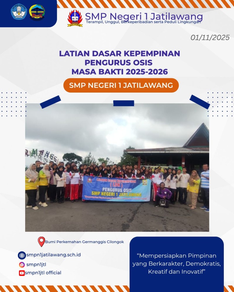 Jum,at 31 Oktober dan 01 November 2025, SMP Negeri 1 Jatilawang telah melaksanakan kegiatan Latihan Dasar Kepemimpinan (LDK) Osis masa bakti 2025-2026 yang diikuti oleh seluruh pengurus OSIS SMP Negeri 1 Jatilawang dan beberapa Kesiswaan SMP Negeri 1 Jatilawang diantaranya Ibu Nokirah, S.Pd, Ibu Maria Ulfah, S.Pd.I., Ibu Ari Triani, S.Pd, bapak Feri A., S.Pd, dan dibantu oleh bapak Rudiana, S.Pd., dan bapak Anugrah Satya A., S.Pd. LDK ini dilaksanakan di Germanggis Cilongok, dalam kegiatan LDK ini memiliki tujuan untuk dapat membangun jiwa kepemimpinan yang mampu beradaptasi dan berintegritas tinggi di era transformasi digital. Dengan adanya kegiatan LDK ini diharapkan agar dapat meningkatkan jiwa kepemimpinan, Kerjasama, solidaritas serta siswa dapat paham terkait dasar-dasar dalam berorganisasi dan dalam membangun kebersamaan antar sesama.