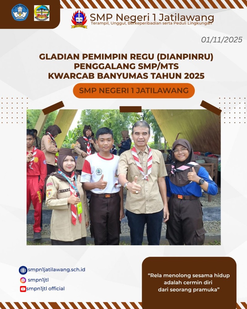 Kegiatan Gladian Pimpinan Regu (DIANPINRU) Penggalang SMP/MTS Kwarcab Banyumas Tahun 2025 dihadiri oleh bapak Kepala Dinas Kabupaten Banyumas Bapak Drs. Joko Wiyono, M.Si. Dalam kegiatan tersebut salah satu siswa SMP Negeri 1 Jatilawang yakni Annisa Dwi Septianingsih berhasil menjawab pertanyaan yang berkaitan dengan Materi Kepemimpinan yang diberikan oleh bapak Kepala Dinas Kabupaten Banyumas bapak Drs. Joko Wiyono, M.Si.